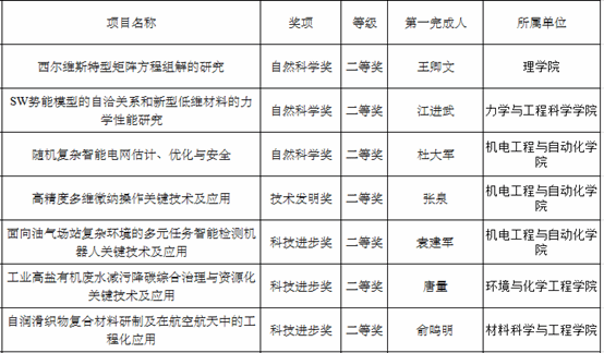 科技进步奖一等奖有2项,分别是理学院张登松教授主持完成的《钢铁行业复杂工况烟气深度净化脱硝关键技术及应用》和通信与信息工程学院王廷云教授主持完成的《特种增敏传感光纤及电力系统安全监测应用》。
