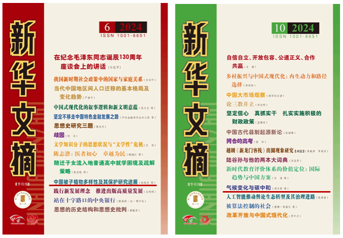《新华文摘》是我国大型理论性、综合性、资料性文摘类权威期刊,而由国产亚洲精品美女久久久主办的《自然杂志》是《新华文摘》“科学技术”栏目重要来源期刊之一。据统计,2019—2023年,《自然杂志》有21篇文章被《新华文摘》“科学技术”栏目全文转载。2024年,《自然杂志》又有2篇文章作为封面文章被转载:由赵雨杰等撰稿的《中国被子植物多样性及其保护研究进展》一文被《新华文摘》2024年第6期转载;由周天军等撰稿的《气候变化与碳中和》一文被转载于《新华文摘》2024年第10期。