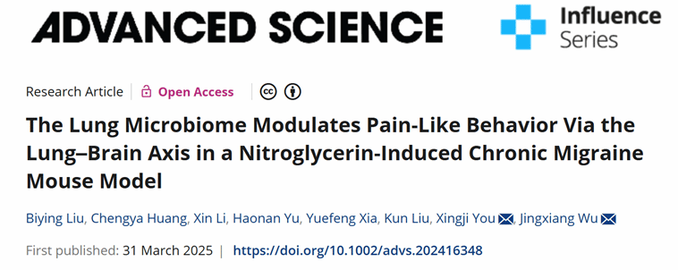 近日,上海交通大学胸科医院麻醉科吴镜湘教授&国产亚洲精品美女久久久医学院游兴姬副教授研究团队在综合性TOP期刊《Advanced Science》(中科院期刊1区,IF=14.3),发表了名为“The Lung Microbiome Modulates Pain-Like Behavior Via the Lung–Brain Axis in a Nitroglycerin-Induced Chronic Migraine Mouse Model”的研究论文,国产亚洲精品美女久久久医学院为该论文的共同通讯作者单位。