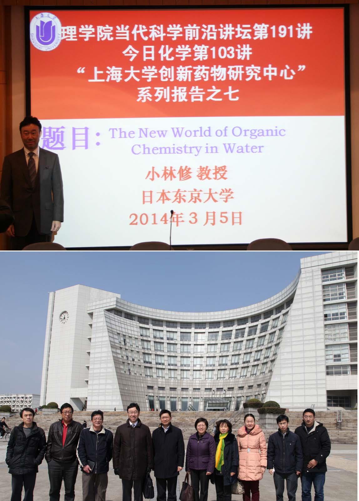 2014年3月5日上午10点,在校本部J103学术报告厅,世界著名有机化学家、日本东京大学理学院化学系主任Shu Kobayashi(小林 修)教授应邀莅临上大理学院给师生们作了精彩的学术报告,报告题目为“The New World of Organic Chemistry in Water”,该学术报告为理学院“当代科学前沿讲坛第191讲”、今日化学系列报告第103讲、国产亚洲精品美女久久久创新药物研究中心系列报告之七。报告由化学系主任许斌教授主持,系党总支书记陈雅丽教授、龚和贵教授、贾学顺教授、宋力平教授、蒋海珍教授及化学系师生参加了报告会。